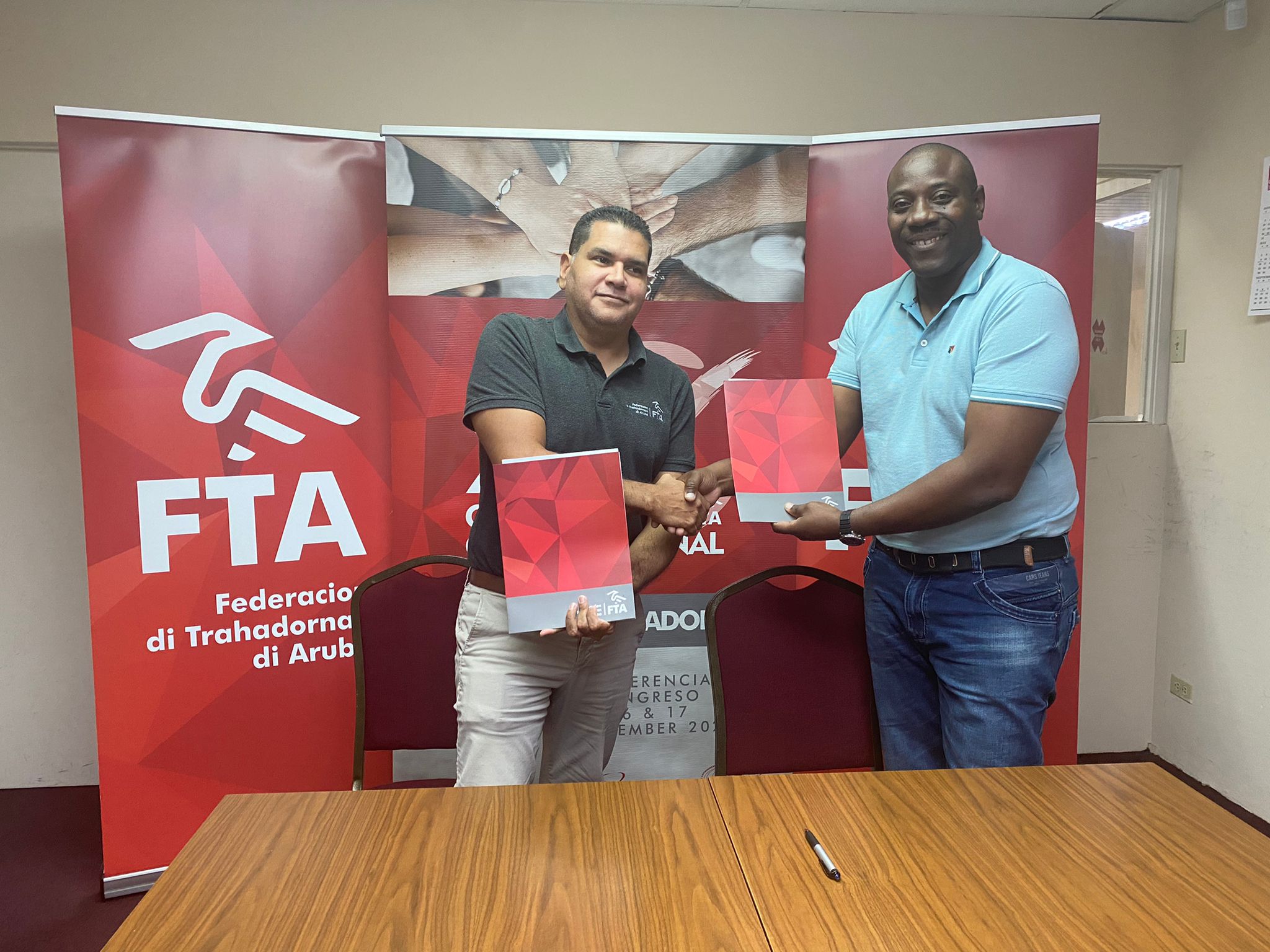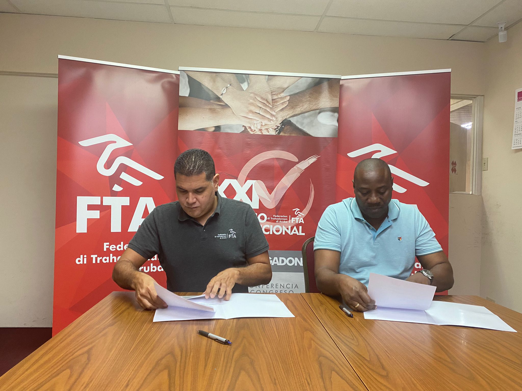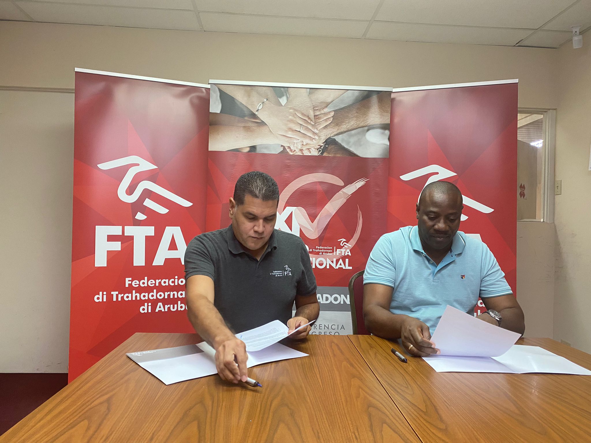 Algemene Federatie van Bonairiaanse Werknemers i Federacion di Trahadornan di Aruba ta firma un protokòl di koperashon, firmando e protokòl aki, e dos sindikatonan aki lo bai traha huntu, den solidaridat i union pa yuda otro, sostené otro i fortifiká otro ku e propósito pa hasi uzo di tur konosementu, eksperensia i fasilidatnan.